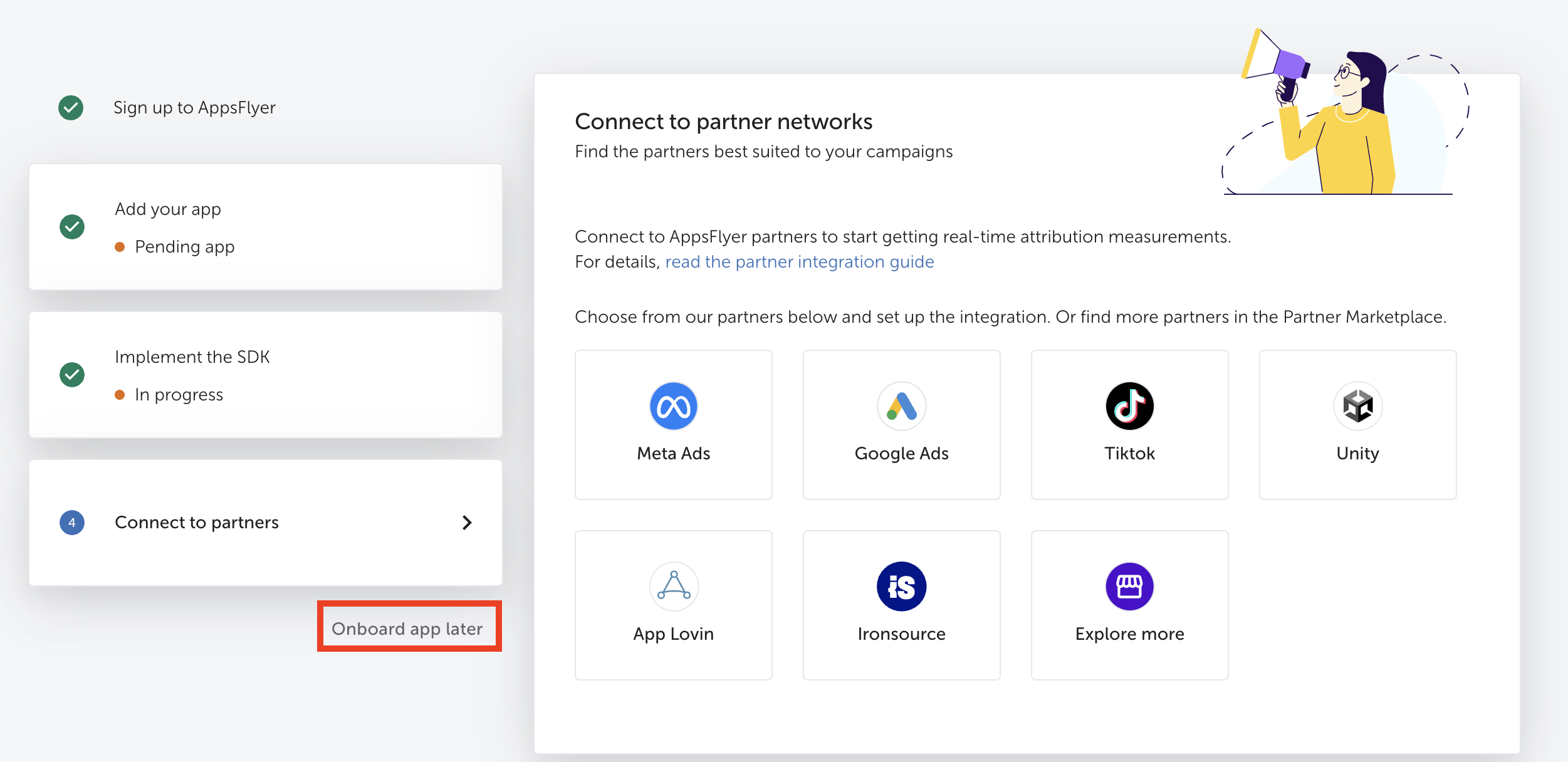 Step 8: 아래 Connect to partners도 지금 진행하지 않기 때문에 Onboard app later를 눌러줍니다.