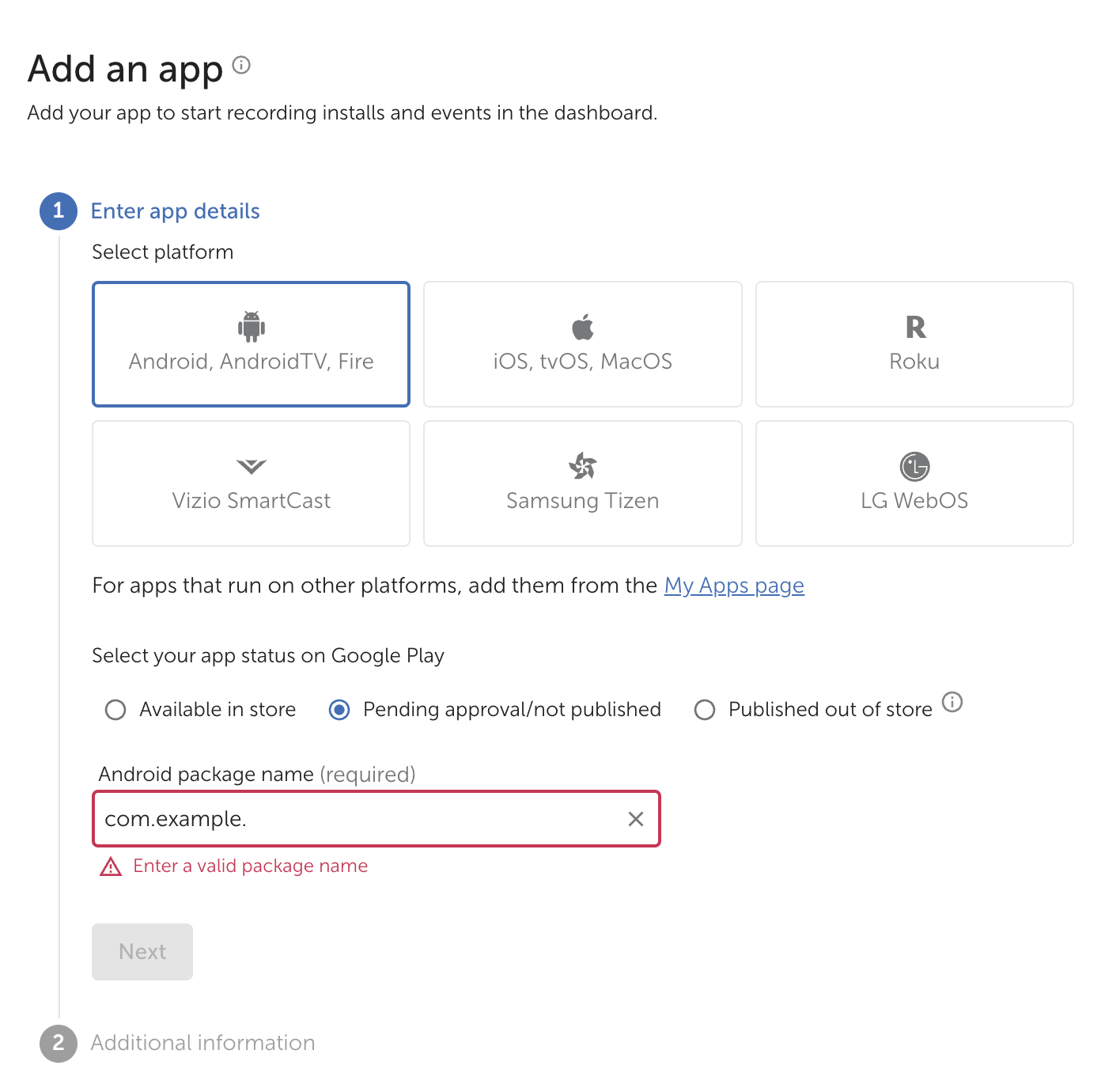 Step 4: 먼저 플러터는 Android, IOS 모두를 지원하므로 Android부터 진행합니다. 출시된 경우 Available in store, 출시되지 않은 경우에는 Pending approval/not published, 스토어가 아닌 루트로 배포된 경우에는 Published out of store를 눌러주시면 됩니다. 아래 Android package name에서는 아래 android > app > src > main > AndroidManifest.xml에 첫 줄에 보시면 package="com.example.이름"이 나오는데 이 이름을 넣어주시면 됩니다. practice, project 이런 일반 명칭은 사용할 수 없다고 나올 것입니다.