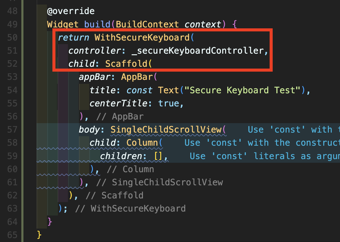 Step 4: Scaffold 위젯을 WithSecureKeyboard 위젯으로 감싸주고 controller에 _secureKeyboardController를 전달합니다.