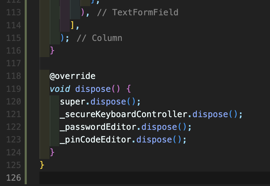 Step 6: 숫자 키패드를 위한 핀 코드 TextField 위젯도 아래처럼 만들어줍니다. (맨 아래에 전체 코드 첨부하였습니다) 여기서 꼭 변경하실 부분은 아래 104번째 라인에 있는 type: SecureKeyboardType.NUMERIC입니다.
