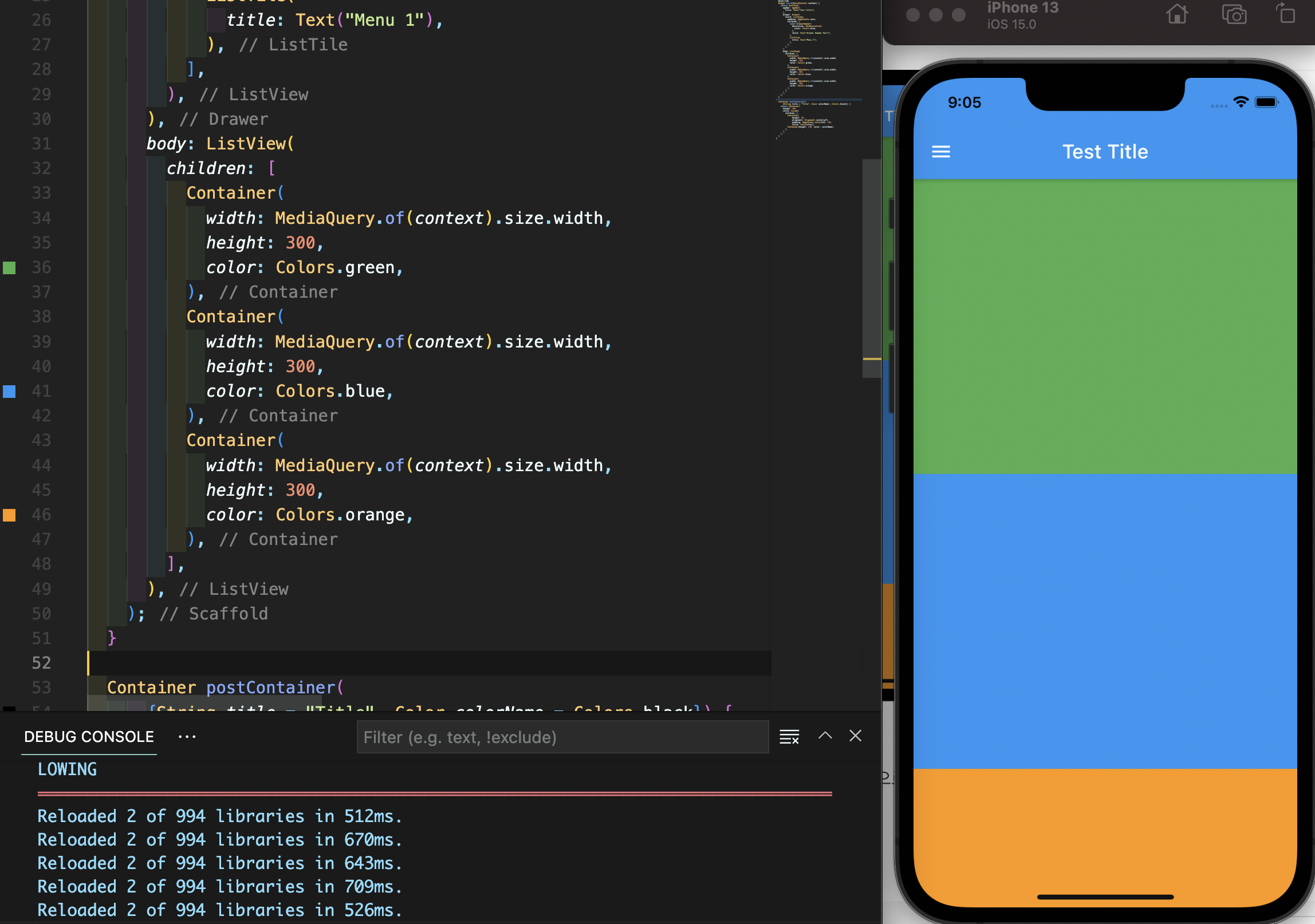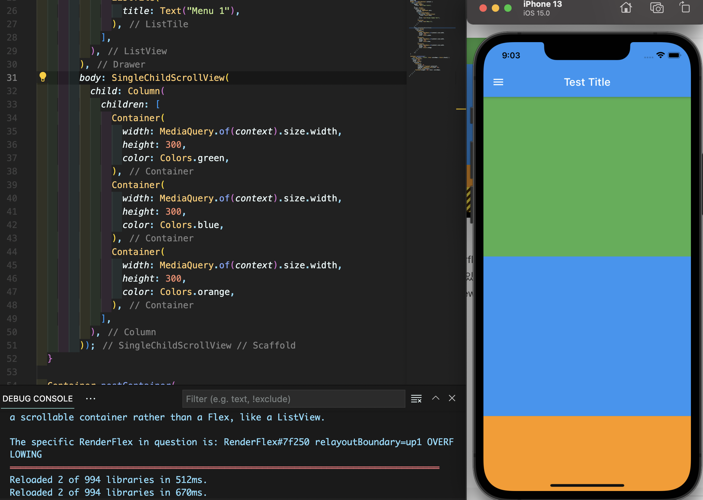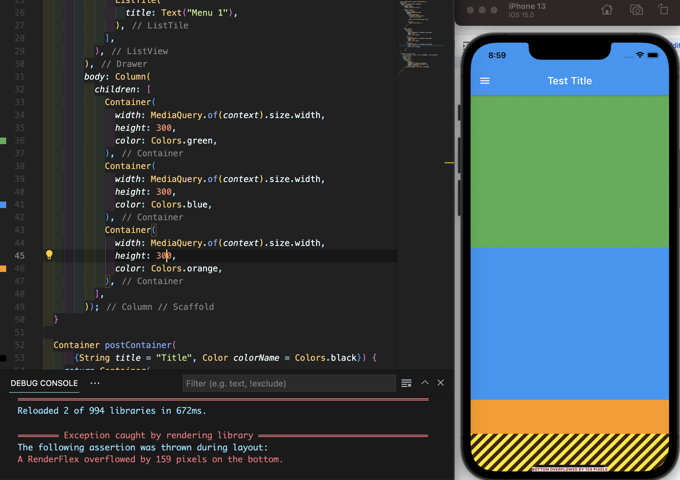 위 이미지를 보면 시뮬레이터 부분에 에러가 나오고, 좌측 하단의 DEBUG CONSOLE에서도 "A RenderFlex overflowed by 159 pixels on the bottom."이라고 에러 메시지가 출력되는 것을 확인할 수 있습니다. 이와 같이 일반적으로 출력할 수 있는 범위를 초과하는 경우에는 이 초과하는 것을 스크롤 할 수 있게 해주는 위젯을 사용해야 하는데 그 중의 하나가 SingleChildScrollView입니다.