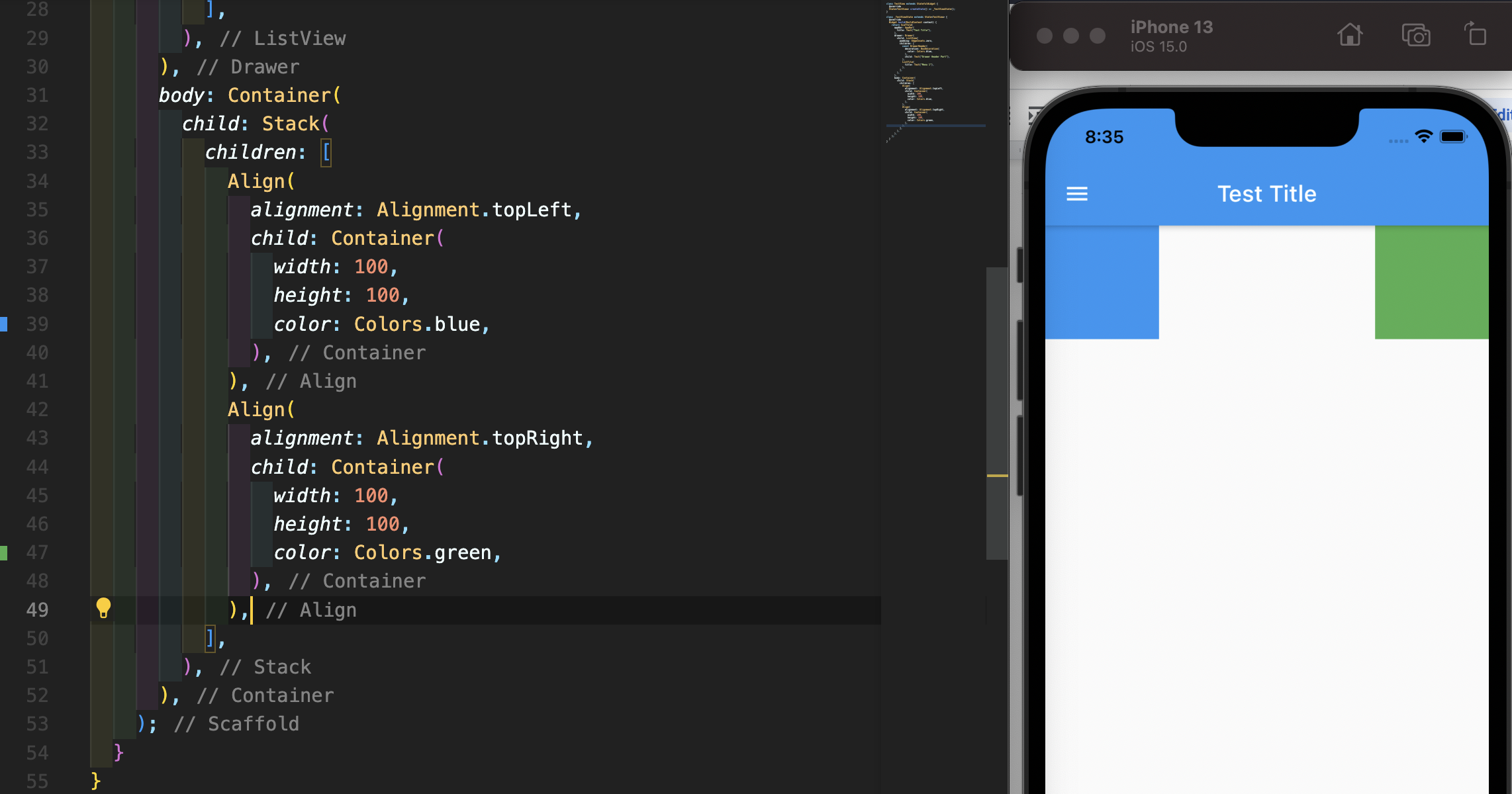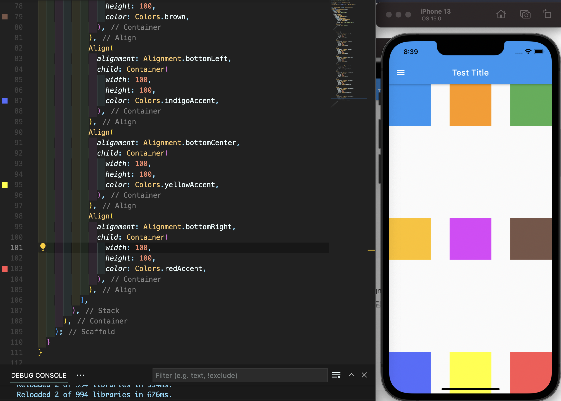 Align 위젯의 사용법은 상당히 간단합니다. alignment: Alignment.topLeft 형태로만 사용하면 바로 적용되며 Alignment에는 topLeft, topRight, topCenter, centerLeft, center, centerRight, bottomLeft, bottomCenter, bottomRight이 사용됩니다.