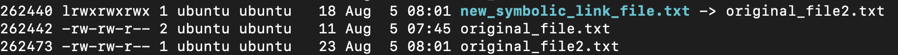 위를 보면 하드링크와 달리 new_symbolic_link_file.txt -> original_file2.txt를 가리키는 것으로 표현이 되었습니다. 이 심볼릭 링크는 파일이 추가적으로 생성되며, 원본의 아이노드를 가리키는 주소를 갖게 됩니다. (바로가기로 생각하면 됩니다)