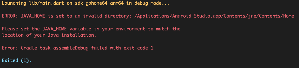 초기 세팅시 Mac(애플 실리콘 기준)에서 플러터로 안드로이드 에뮬레이터 등을 구동하려고 할 때, 아래와 같은 오류가 날 때, 해결 방법입니다.