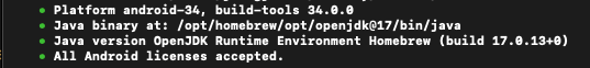 저는 openjdk17를 brew를 이용해 설치하였습니다. 먼저 flutter doctor -v 명령어로 터미널에 입력하시면 대체적으로 아래와 같은 오류가 나올 것입니다.