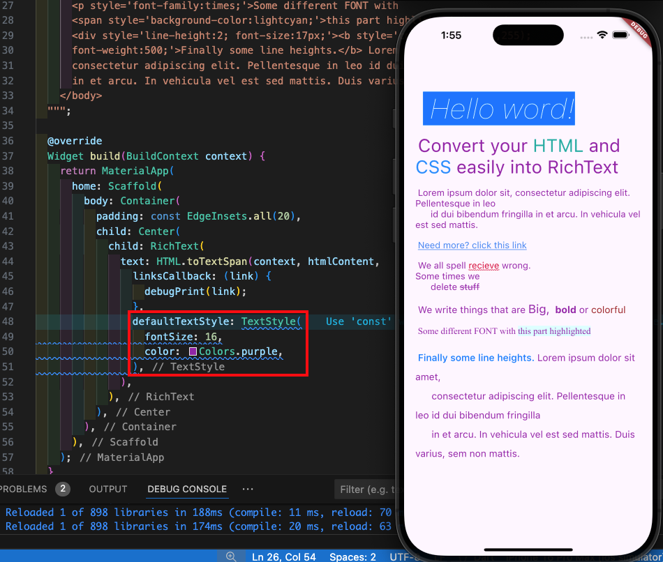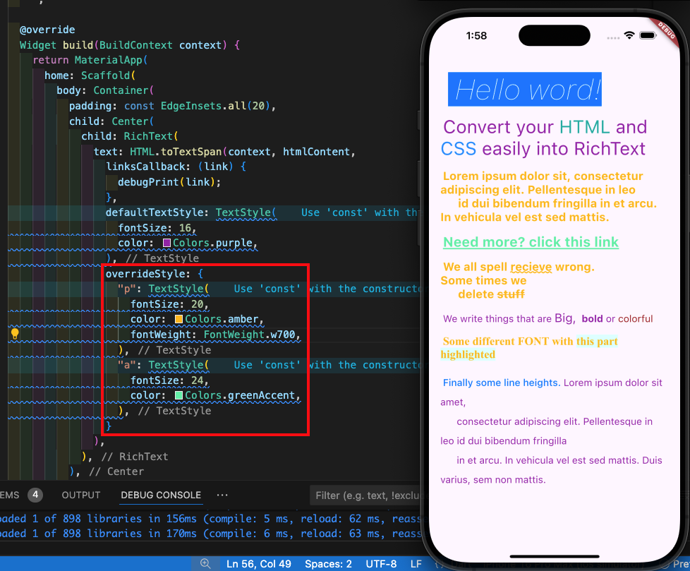 Step 8: HTML 코드를 태그 별로 이를 재정의하는 방법도 있습니다. 예시는 아래와 같으며, 설명을 드리면 p 태그를 아래와 같이 폰트 크기 20, amber 색상, 굵기를 700으로 조정한 것이고, overrideStyle이 Map<String, TextStyle>? 형태이므로 여러 태그들을 재정의할 수 있습니다.