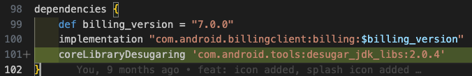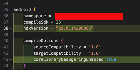 Step 6: android > app >build.gradle 파일 접속하셔서 android 내에 ndkVersion을 위의 버전으로 변경해주시면 됩니다. 저의 경우 아래처럼 진행하였고 추후 빌드하실 때 desugaring 이슈가 나오시는 분들은 저처럼 아래에 coreLibraryDesugaringEnabled true도 넣어주시고 dependencies 부분에도 coreLibraryDesugaring 'com.android.tools:desugar_jdk_libs:2.0.4'를 추가해주셔야 합니다.