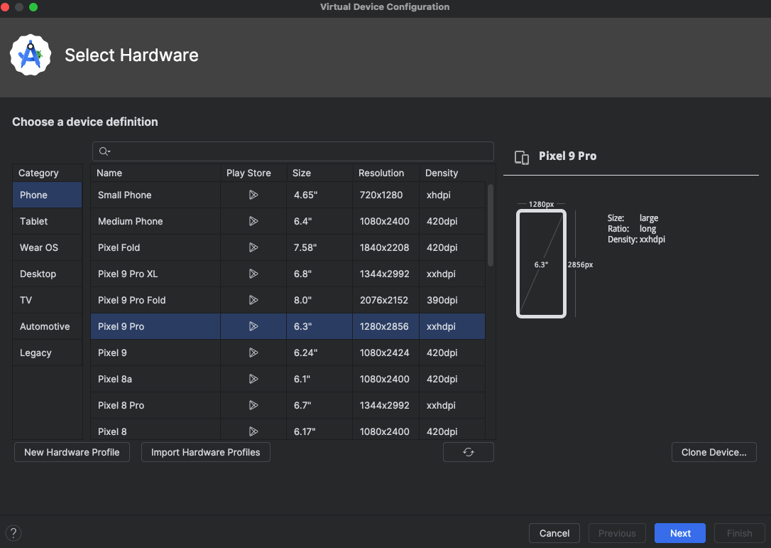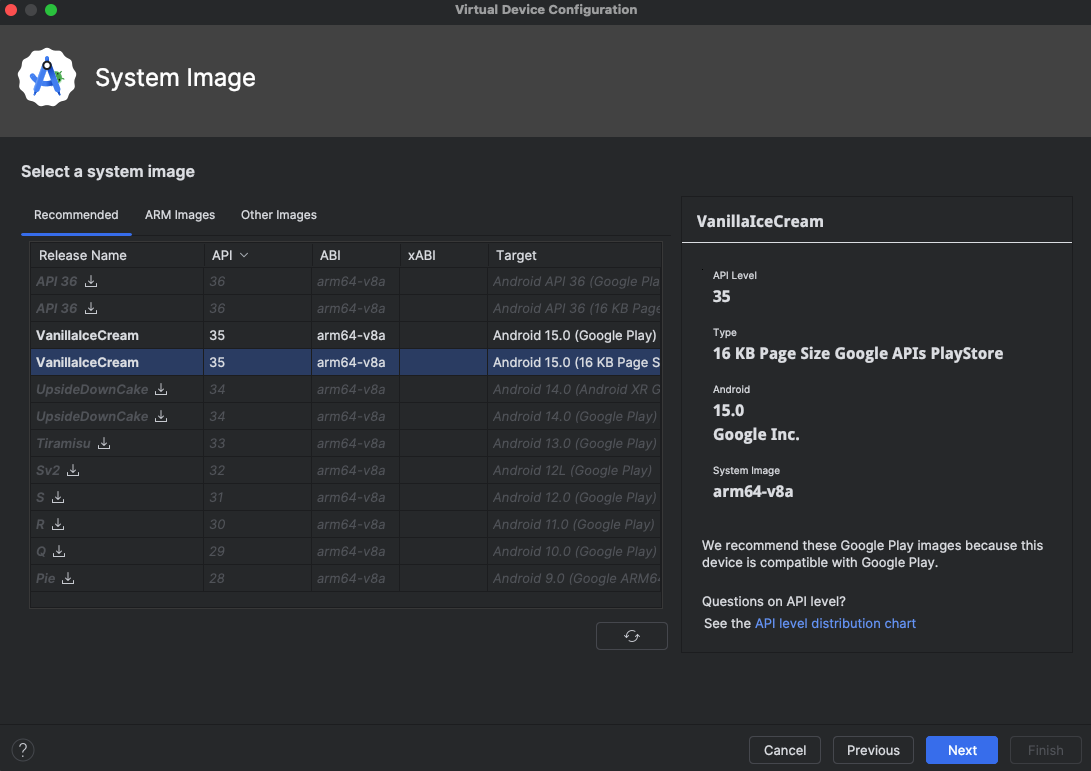 Step 9: 안드로이드 API 35이상 중 16KB Page Size가 적혀 있는 것으로 선택하시고 Next 누르시고 완료하시면 됩니다.