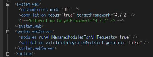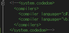 Step 8: 이제 Visual Studio를 열어주시고 (저는 2019 Community, .net framework는 4.7.2를 기준으로 하였습니다) Web.config 를 열어줍니다. 저의 경우에는 아래 부분의 codedom 파트를 모두 주석 처리하였습니다. 그리고 system.web과 system.webServer 부분을 추가합니다.