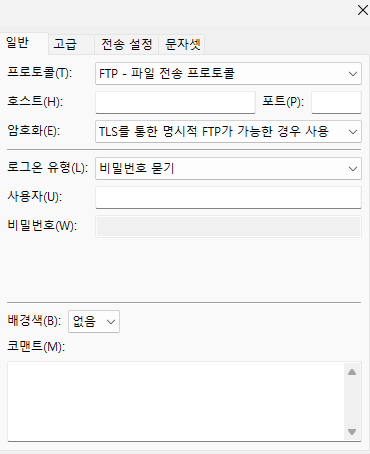 Step 6: 여기에서 프로토콜은 FTP로 해주시고, 호스트는 연결하신 도메인 주소가 될 것이고, 포트(port)는 카페24 호스팅관리의 FTP 부분에 나옵니다. 그것을 입력하시고 로그온 유형은 저는 "비밀번호 묻기"로 진행했습니다. 사용자는 카페24 호스팅의 ID, 추후 비밀번호는 FTP 비밀번호를 입력하시면 접속이 됩니다.