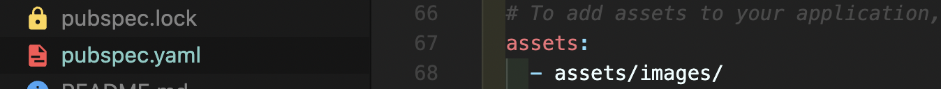 Step2: 프로젝트 폴더에 보면 pubspec.yaml이라는 파일이 있는데 여기에 assets: 부분에 68번째 줄처럼 경로를 추가해줍니다.