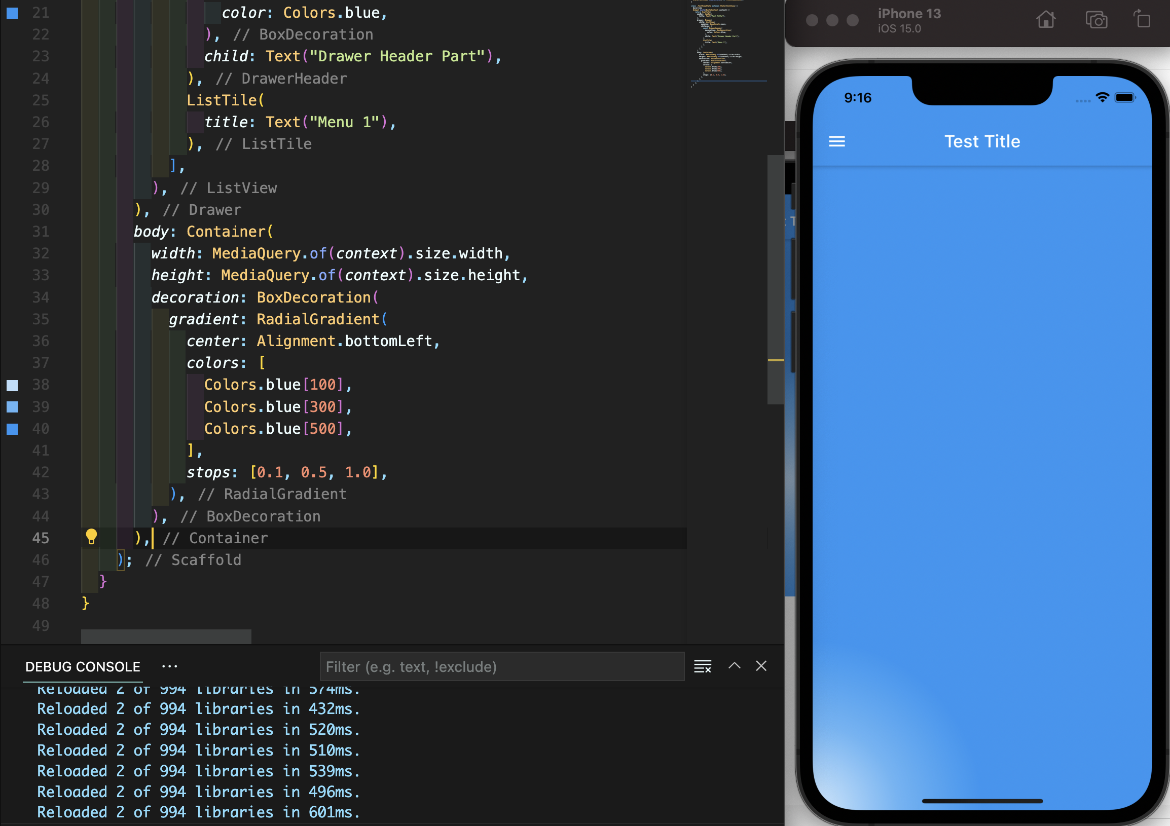 LinearGradient(선형 그라데이션)을 적용한 모습입니다. linear는 선, 직선 모양의 의미로 begin과 end를 수반하여 시작 방향과 끝 방향이 정해져 있는 그라데이션이며 colors의 속성에는 배열 형태로 여러 색상을 부여할 수 있습니다. 플러터에서 Colors.색상명 다음에 대괄호 [ ]를 사용하여 100부터 900까지 백 단위의 숫자를 사용하면 옅게, 진하게의 강도를 나타낼 수 있습니다. (컬러마다 숫자의 범위가 다릅니다) 즉 Colors.blue[900]는 제일 진한 파란 색이며, Colors.blue[100]는 가장 옅은 파란 색입니다.