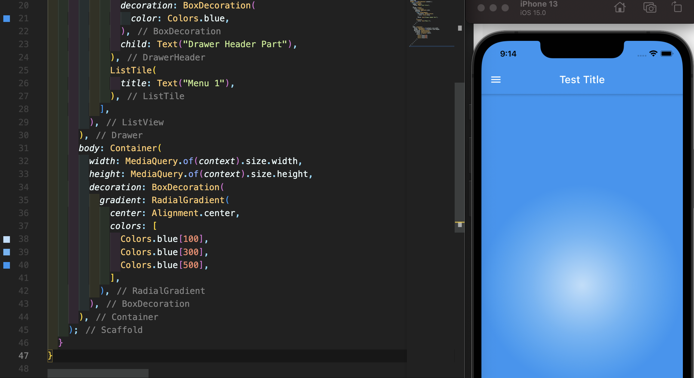 RadialGradient는 원형 그라데이션을 표현할 때 사용합니다. 사용법은 LinearGradient와 유사하나 다른 점은 원형 그라데이션이어서 중심점의 기준을 정해주어야 하며 생략하면 자동으로 Alignment.center가 기본값이 됩니다. 또한 stops 속성을 통해 동심원 즉 각 색깔의 인덱스에 맞는 원의 크기를 정해줄 수 있습니다.