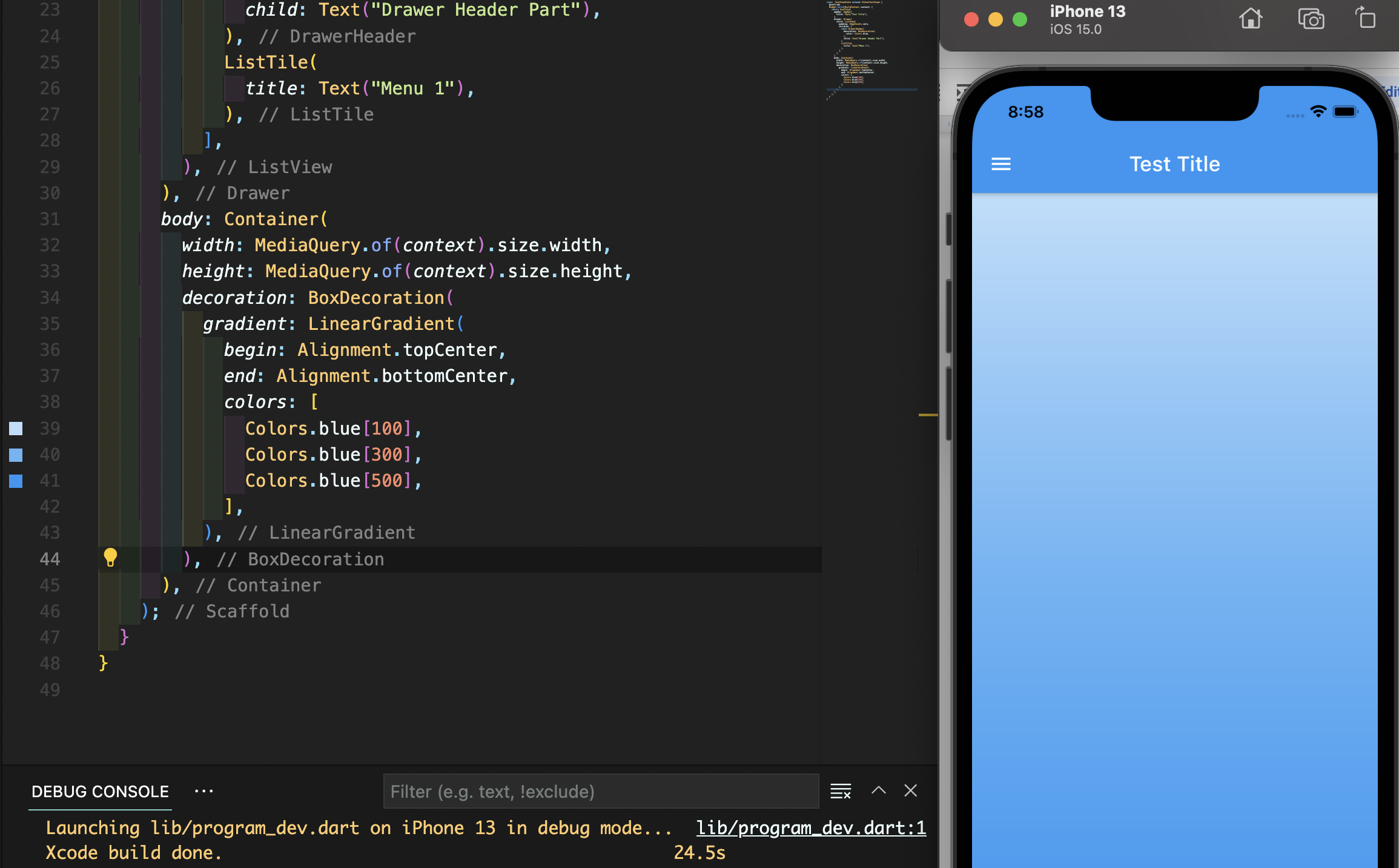 LinearGradient(선형 그라데이션)을 적용한 모습입니다. linear는 선, 직선 모양의 의미로 begin과 end를 수반하여 시작 방향과 끝 방향이 정해져 있는 그라데이션이며 colors의 속성에는 배열 형태로 여러 색상을 부여할 수 있습니다. 플러터에서 Colors.색상명 다음에 대괄호 [ ]를 사용하여 100부터 900까지 백 단위의 숫자를 사용하면 옅게, 진하게의 강도를 나타낼 수 있습니다. (컬러마다 숫자의 범위가 다릅니다) 즉 Colors.blue[900]는 제일 진한 파란 색이며, Colors.blue[100]는 가장 옅은 파란 색입니다.