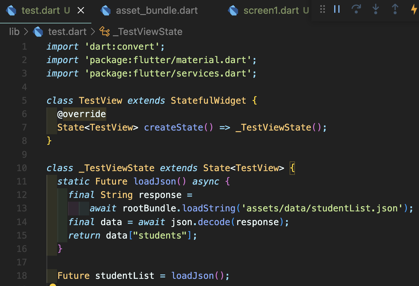 위 코드를 보시면 18번째 Future studentList를 선언해서 loadJson() 함수의 리턴값으로 변수에 넣어주도록 작업했습니다. Future에 <>를 이용해서 <String> 등으로 표시해줘도 되고 생략해도 괜찮습니다. 다만 붙여주는 것을 권장합니다. 11번째 줄에 static Future loadJson() async 형태로 사용했는데 static를 붙여주는 것은 아래 loadJson() 함수를 생성자 없이 사용하기 위한 목적이고, 실무에서는 이렇게 사용하기보다는 파일을 분리해서 사용할 것입니다. Future, async, await, json 키워드를 사용하기 위해 1,2,3번째 줄에 import 구문들을 추가해주었습니다. rootBundle.loadString을 통해 json 파일을 가져오고, 14번째 줄에 decode 함수를 통해 data에 값을 넣어주고 반환해주면 됩니다. 이 decode 과정에서 처리되는 시간이 다소 소요될 수 있기 때문에 await 키워드를 추가해줍니다.