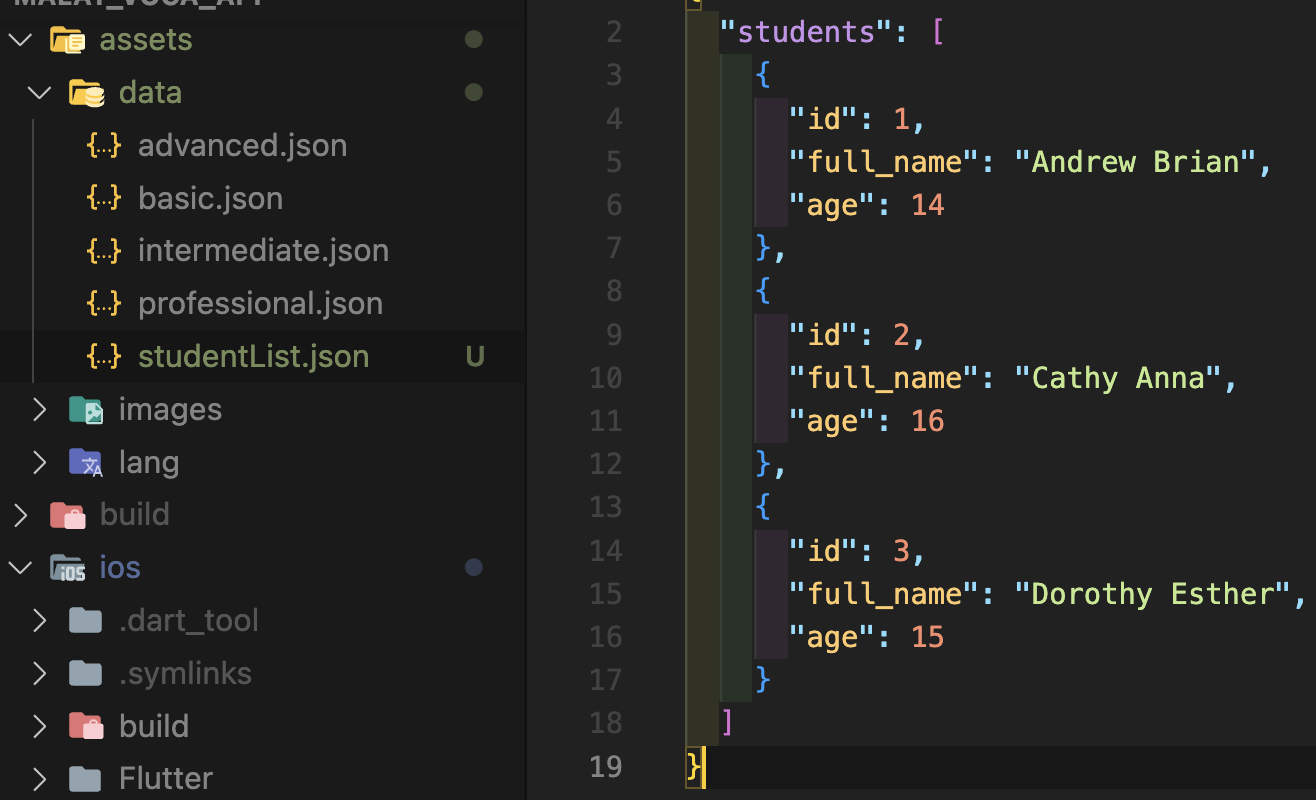 먼저 json 파일을 준비해줍니다. 저는 studentList.json 파일에 "students"를 키로, 값으로는 배열 형태로 넣었습니다.