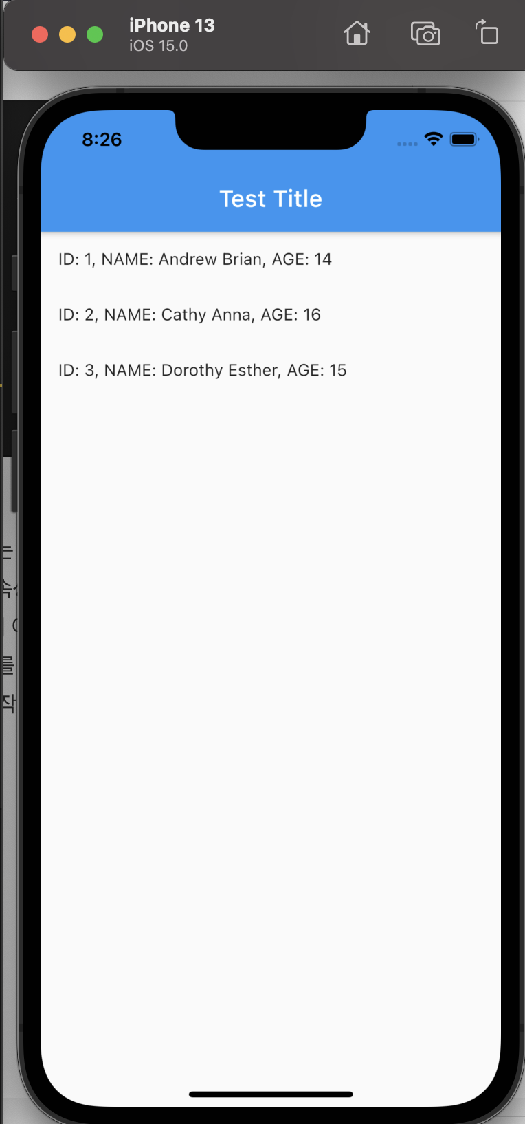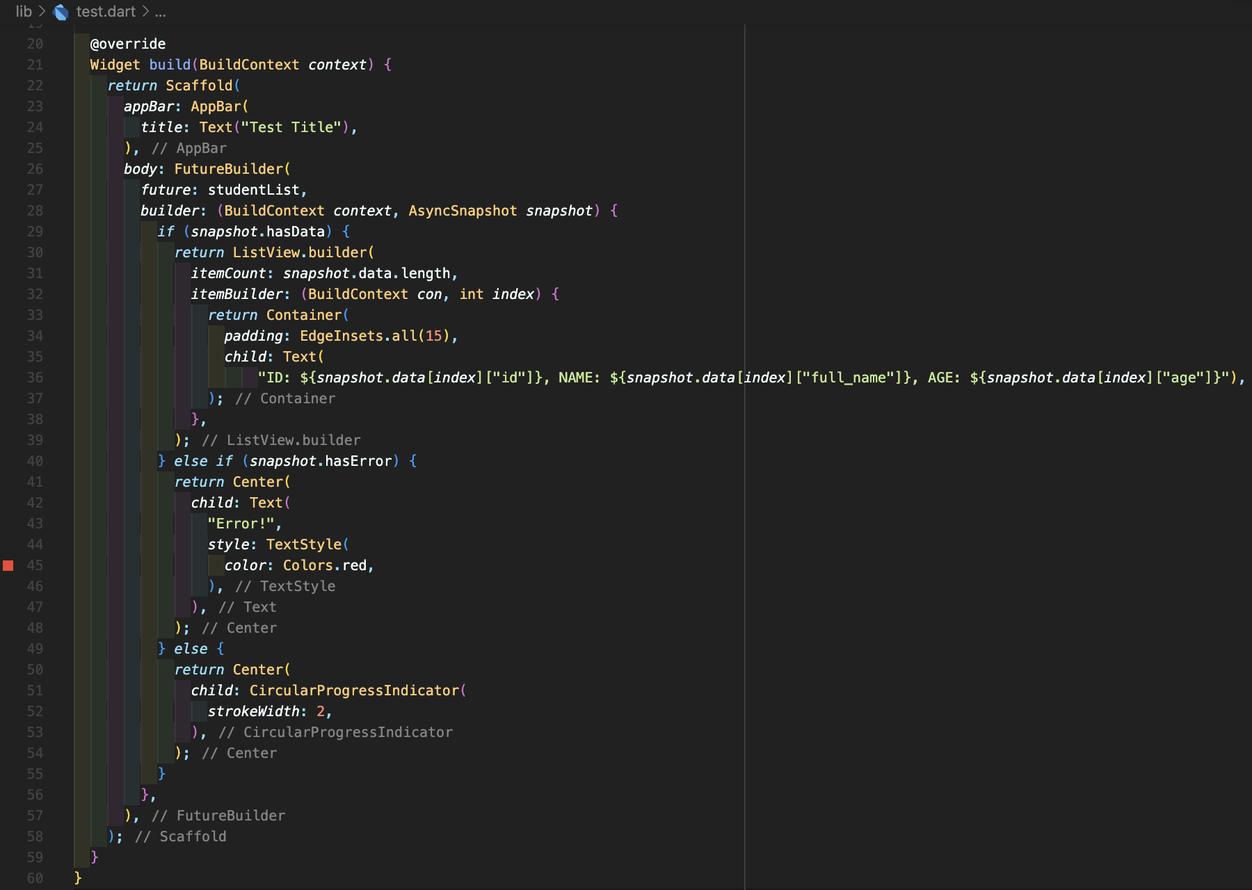 이번에는 FutureBuilder 위젯입니다. 이 FutureBuilder 위젯은 말 그대로 Future 타입을 사용하는 경우에 사용되는 위젯이며 에러 처리, 대기하는 즉 로딩되는 동안 로딩중 표시 등 여러가지 상황에 대처할 수 있습니다. FutureBuilder 속성으로, future 속성에 studentList를 넣어줍니다. snapshot은 진행된 상황 즉 현재 연결 상태, 받아온 데이터 등을 표시할 때 사용한다고 이해하시면 되며 여기에 접근하여 데이터를 가지고 올 수 있습니다. 29번째 줄에 data가 있는 경우 저번에 다루었던 ListView.builder를 사용해서 데이터를 연속적으로 불러올 수 있습니다. 40번째처럼 데이터를 불러오지 못하는 경우 즉 에러가 있는 경우에는 에러 메시지를 출력할 수 있도록 작업했고 49번째 라인, 그 이외 상황 및 로딩 중일 때에는 로딩 중 표시를 할 수 있도록 코드를 구성했습니다.