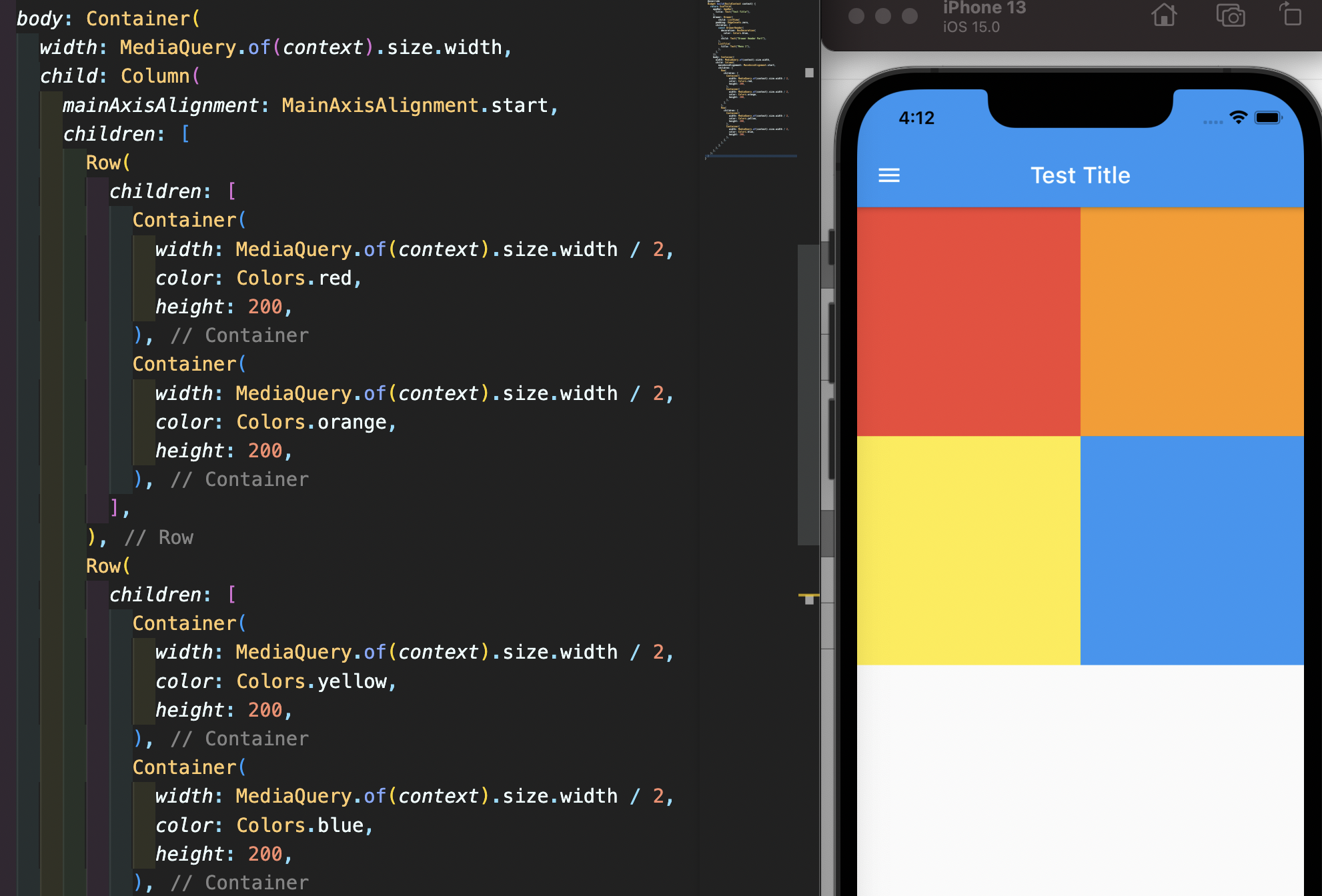 Row와 Column를 조합한 모습이다. MediaQuery.of(context).size를 활용하면 현재 디바이스의 사이즈를 구할 수 있다.