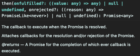 위에 기본 예시를 작성해놓았습니다. Promise에는 resolve, reject 함수를 인자로 받을 수 있습니다. resolve 함수에 메시지를 작성해놓고 그 메시지를 then의 인자로 전달할 수 있습니다. 이 then은 첫 번째, 두 번째 인자를 받을 수 있는데 첫 번째 인자로는 아래 스크린샷 찍은대로 onfulfilled 즉 성공한 resolve 함수, 두 번째 인자로는 onrejected 즉 실패한 reject 함수의 인자를 전달할 수 있습니다.