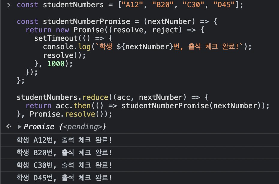 그리고 저번 시간에 reduce 함수에 대해 살펴보았습니다. 이 reduce함수와 Promise 객체를 같이 활용할 수도 있습니다. 먼저 studentNumbers 배열을 선언해주고 그 다음에 studentNumberPromise로 이름한 Promise 객체를 반환하는 변수를 선언해주었습니다. 1초 뒤에 실행할 수 있는 setTimeout 함수를 선언하고 resolve 함수를 호출해주었고, 마지막에 studentNumbers 배열에 reduce 함수를 실행시켜 acc에 계속 배열의 요소가 들어가고 nextNumber를 다음 인자로 전달함으로써 학생 ${nextNumber}에 변수를 연속해서 전달할 수 있습니다.