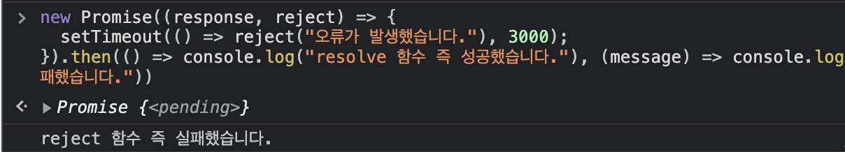 이렇게 then에 2개의 parameter 값을 넣었고 위 setTimeout에는 reject 함수만 호출해주었습니다.