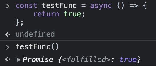 아래 간단한 예제를 확인해보면 testFunc를 async로 선언하여 true를 반환하는 함수가 있을 때 console에서 확인해보면, Promise 객체 <fulfill> 형태로 true가 반환되었음을 보실 수 있습니다.