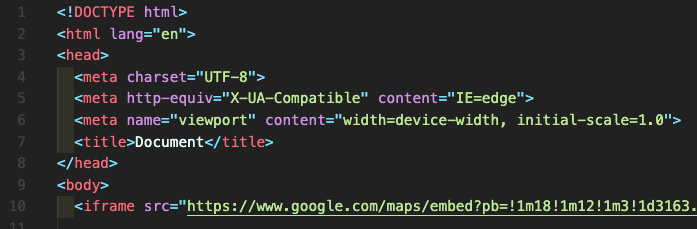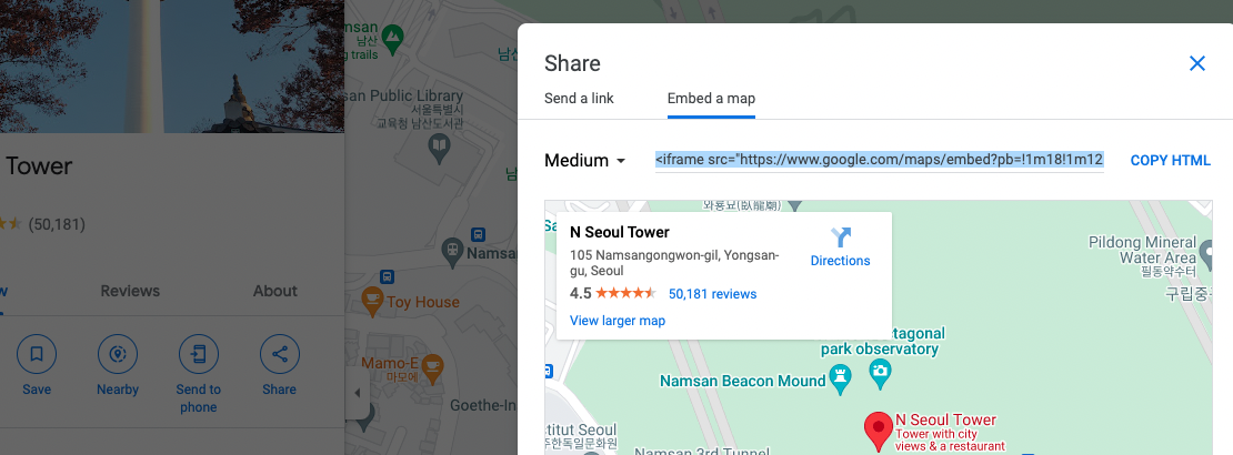 오늘은 iframe 태그에 대해서 알아보도록 하겠습니다. iframe 태그는 쉽게 말해 웹페이지 안에 다른 웹페이지를 넣는 것을 이야기합니다. 많이 쓰이는 예시가 유튜브 영상, 구글 지도 삽입입니다. 이 iframe 태그로 지도를 넣는 방법은 아래처럼 구글 맵스에서 장소를 검색하고 아래 Share (공유) 버튼을 누르고 Embed a map에 가서 COPY HTML 버튼을 누르시면 됩니다.
