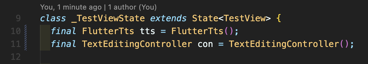 10번째, 11번째 줄처럼 FlutterTts와 TextEditingController 인스턴스를 만들어줍니다.