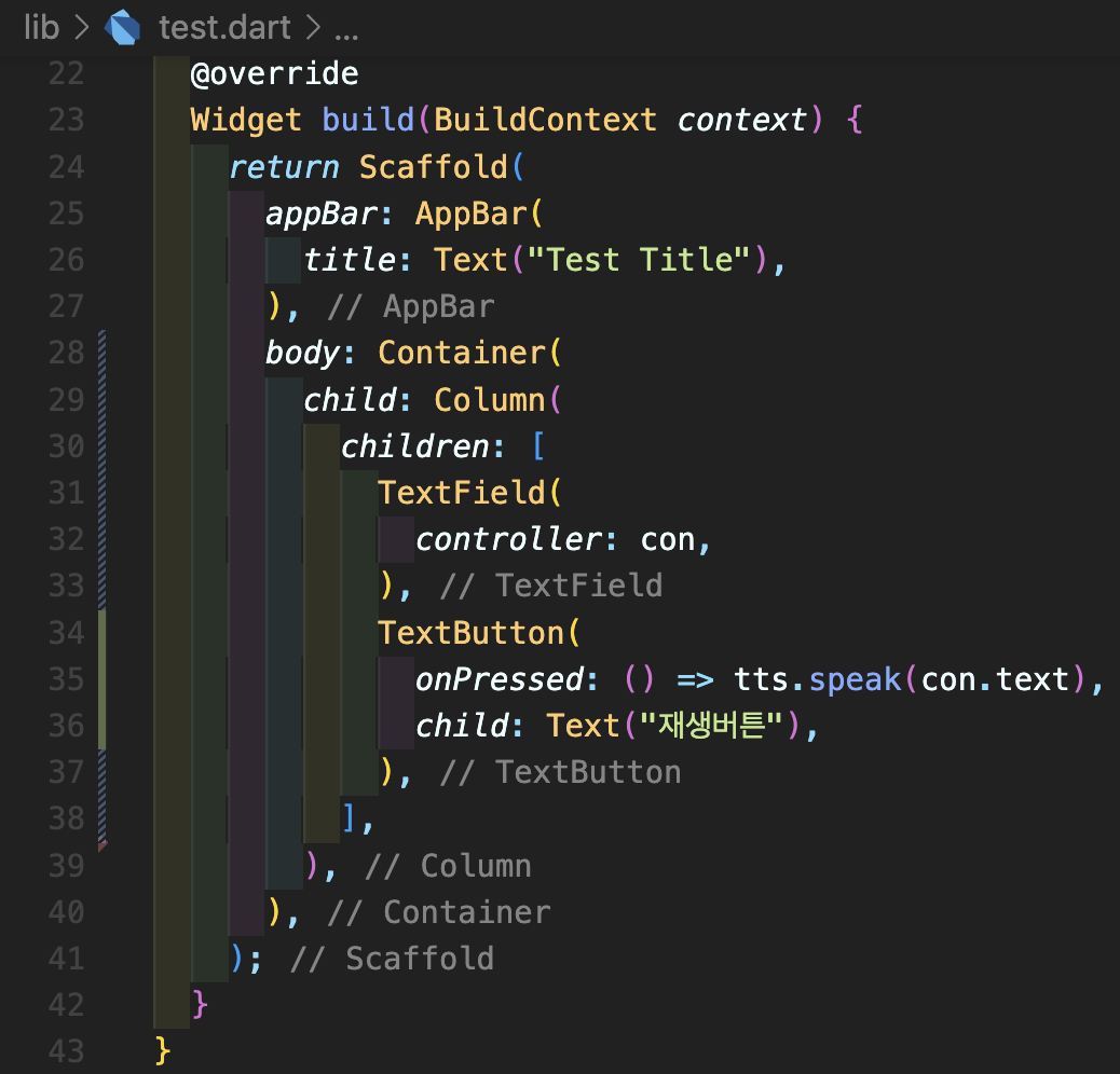 마지막으로 아래처럼 위젯 구성을 마무리해줍니다. TextButton를 눌렀을 때 tts.speak(con.text)를 실행해서 재생되도록 해줍니다.