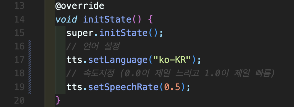 다음으로는 13-20번째 줄처럼 initState 메소드를 만들어주어 초기화될 때 tts.setLanguage("ko-KR")과 tts.setSpeechRate(0.5)를 사용하여 언어와 언어를 말하는 속도를 지정해줍니다. 영어인 경우에는 "en-US"로 적으면 되며 속도는 0.0이 제일 느리고 1.0이 제일 빠릅니다. 보통 0.4에서 0.6 사이를 적는 것이 무난합니다.