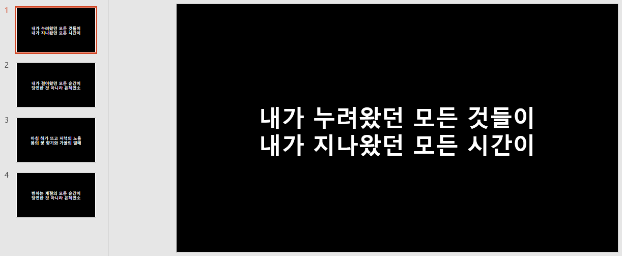 이 배열을 근거로 하여 슬라이드를 추가해가며 가사를 분리하여 만들어줄 수 있습니다. 아래 주석을 참고하시면 됩니다.