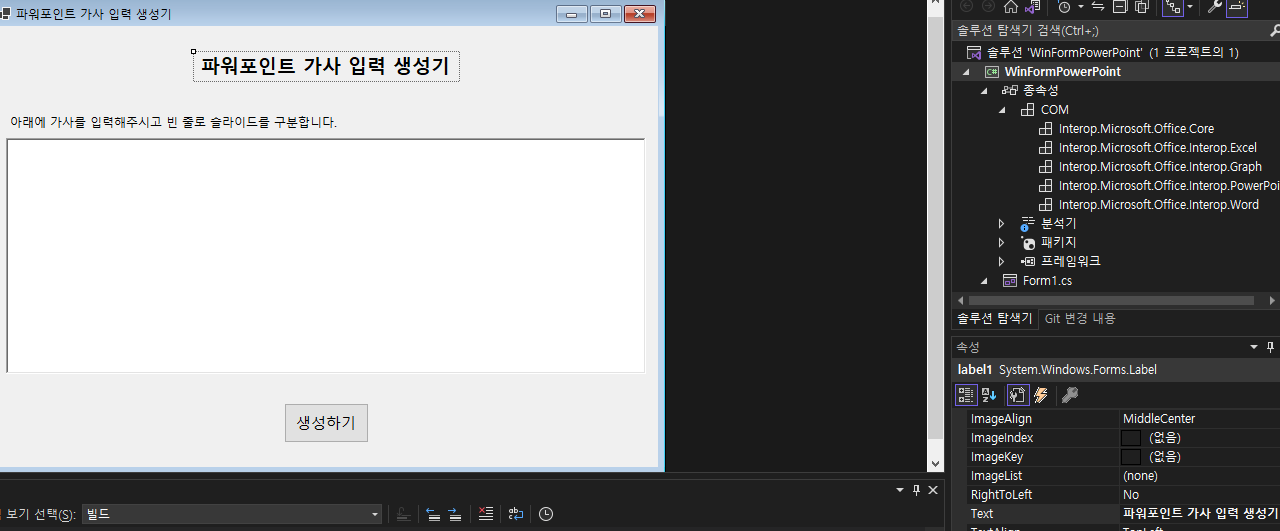 오늘은 WinForms C#으로 가사 텍스트를 파워포인트 슬라이드로 나눠서 변환해주는 프로그램을 만들어보려고 합니다. 제가 개인적으로 교회 방송실을 하면서 찬양 가사를 급하게 파워포인트로 출력해야 할 때 제작의 필요성을 많이 느꼈습니다. 그 이유는 타이핑이나 가사를 2-3줄씩 각각 복사해서 슬라이드에 있는 텍스트 상자에 붙여 넣는 것이 의외로 시간이 걸리기 때문입니다. 그래서 직접 개발을 해보기로 결심하고 그 과정을 아래에 남깁니다.