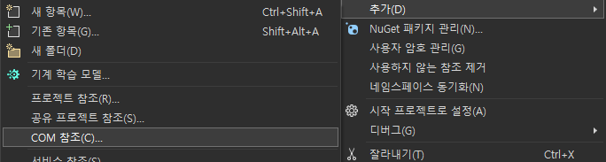 Step 4: 추가(D) -> COM 참조(C)를 누릅니다.
