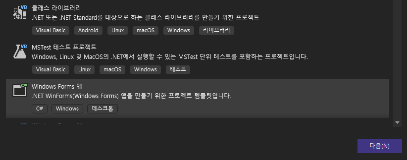 Step 2: 아래에서 Windows Forms 앱을 선택하시면 되며 .NET 6.0으로 저는 선택하고 넘어갔습니다.
