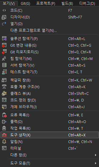 Step 6: 보기 -> 도구 상자(X)를 눌러줍니다.