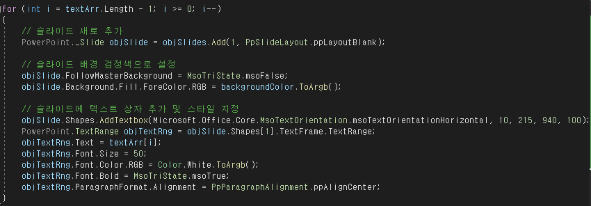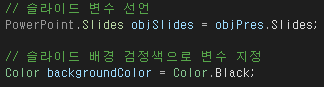 슬라이드 변수 선언해주고 슬라이드 배경을 검정색으로 해줄 수 있도록 변수로 지정합니다.