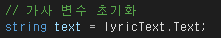 다음으로 가사 변수를 선언했습니다. 노래 찬양 가사를 받아올 것이기 때문에 Form으로부터 Text를 받아옵니다. 저는 Step 9에서 설명드린 속성에서 RichBoxText의 Name을 lyricText로 변경하였습니다.