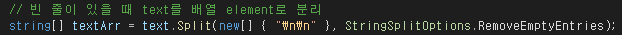 빈 줄을 분리할 수 있게 아래처럼 Split하여 배열로 구성했습니다. 예를 들어 아래와 같이 담기게 됩니다.