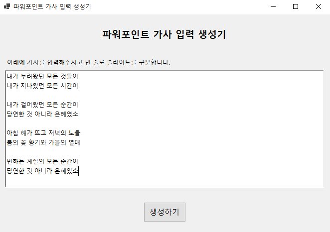이제 실행해서 결과를 보여드리도록 하겠습니다. 아래처럼 "은혜"라는 찬양의 가사 일부를 복사해서 붙여넣고 '생성하기' 버튼을 눌러보았습니다.