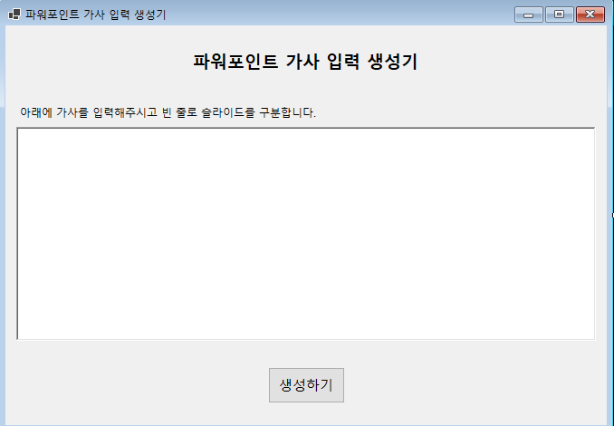 오늘은 WinForms C#으로 가사 텍스트를 파워포인트 슬라이드로 나눠서 변환해주는 프로그램을 만들어보려고 합니다. 제가 개인적으로 교회 방송실을 하면서 찬양 가사를 급하게 파워포인트로 출력해야 할 때 제작의 필요성을 많이 느꼈습니다. 그 이유는 타이핑이나 가사를 2-3줄씩 각각 복사해서 슬라이드에 있는 텍스트 상자에 붙여 넣는 것이 의외로 시간이 걸리기 때문입니다. 그래서 직접 개발을 해보기로 결심하고 그 과정을 아래에 남깁니다.