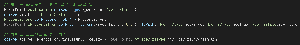 Step 5: 아래처럼 objApp.ActivePresentation.PageSetup.SlideSize를 PowerPoint.PpSlideSizeType.ppSlideSizeOnScreen16x9로 할당해주시면 됩니다.