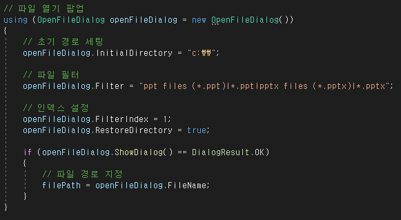 Step 4: using을 사용하여 이 안에 openFileDialog의 내용을 적어줍니다. 주석을 참고하시면 됩니다.