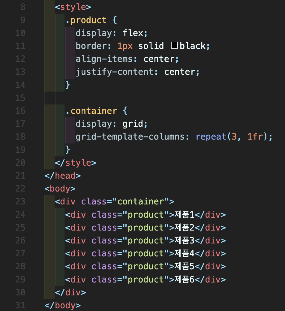 오늘은 HTML과 CSS를 활용해서 Grid를 적용해보는 방법에 대해 살펴보도록 하겠습니다. 먼저 기본적으로 grid를 형성하는 방법에 대해 살펴보겠습니다. 여기에서는 쉬운 예제를 위해 inline CSS로 진행했습니다. 아래 코드처럼 container 클래스의 div 태그와 그 안에 product 클래스의 제품 6개 div 태그들을 넣어주었고 9번째부터 19번째 줄까지 CSS 코드를 작성해주었습니다.