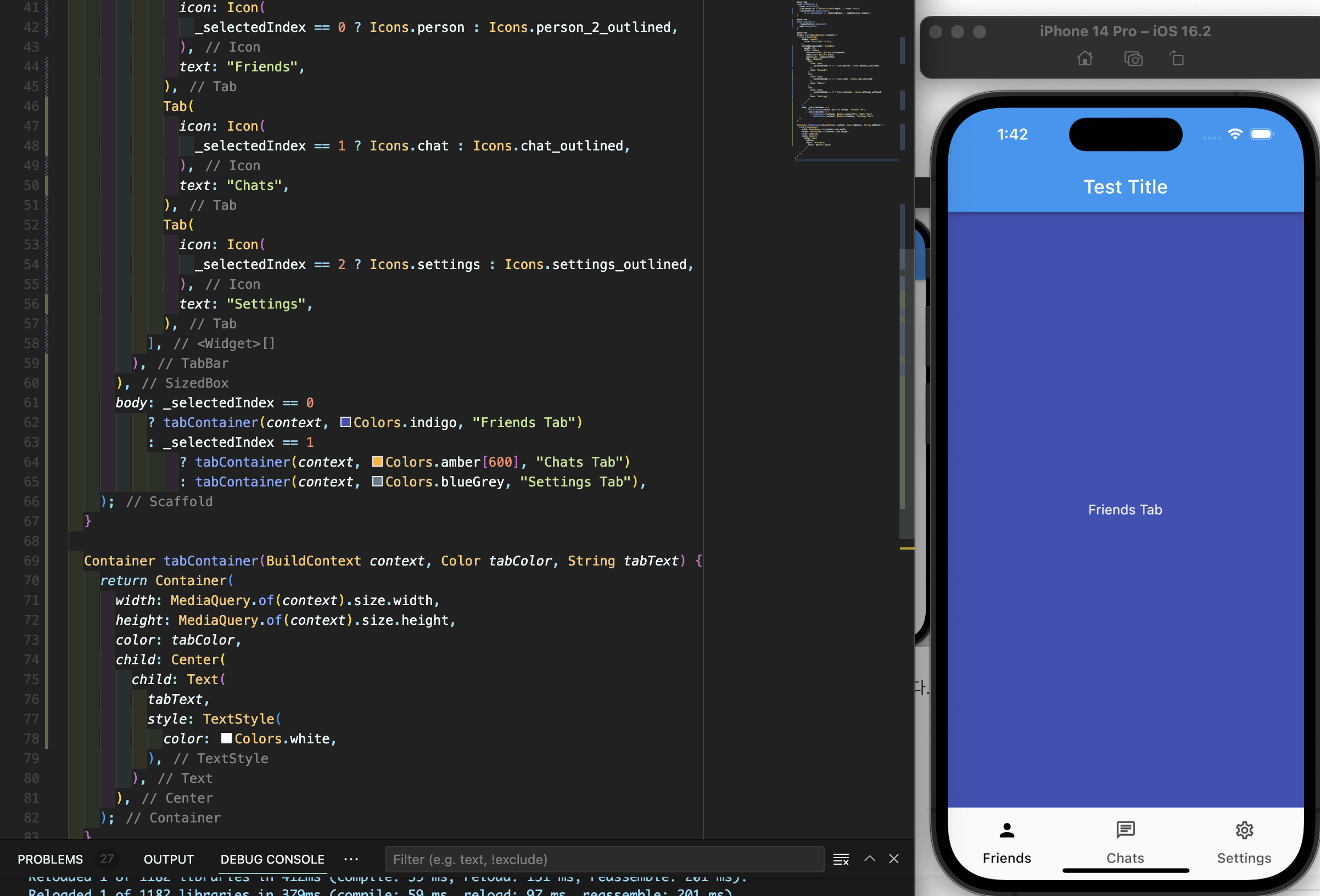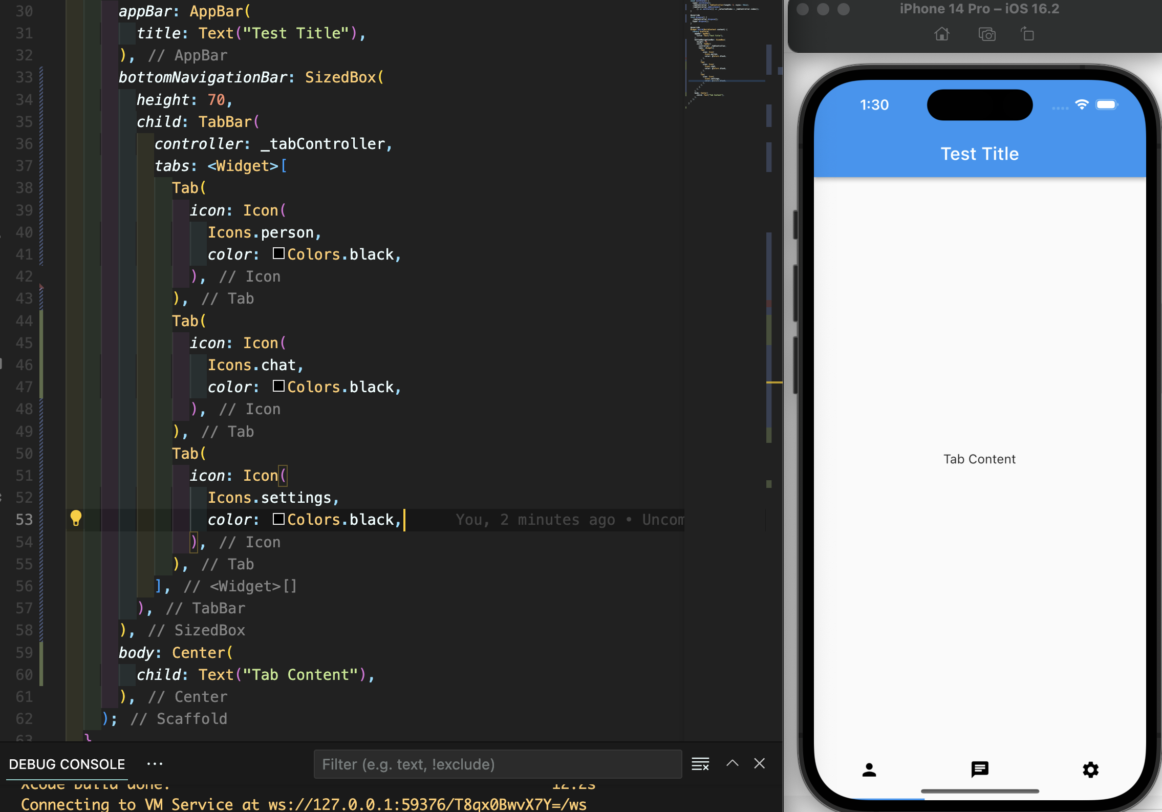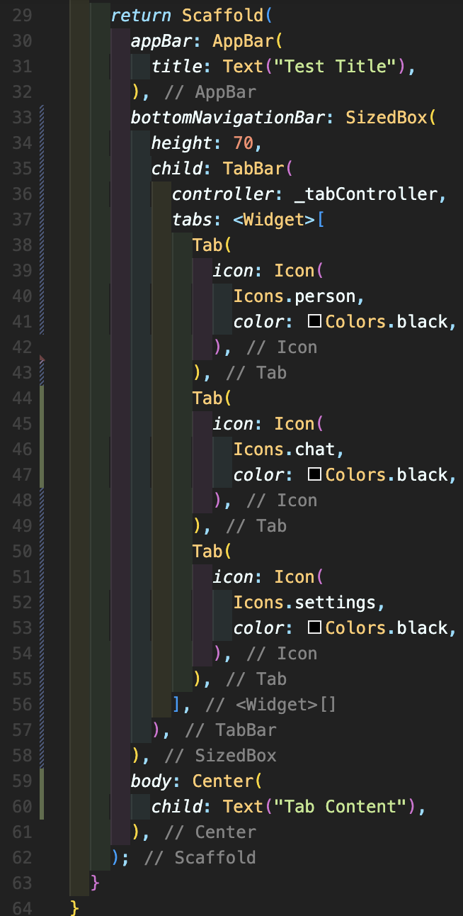Step3: Scaffold 위젯에서 bottomNavigationBar를 추가해주고 33~58번째 줄같이 작성해주시면 됩니다. 제가 여기에서 SizedBox 위젯부터 적은 이유는 height를 별도로 명시해주시기 위함이며 기본 height값으로 괜찮은 경우에는 생략하셔도 됩니다. 그 다음 TabBar 위젯을 적고 controller, tabs에 다음처럼 적어주면 되며 여기에는 배열 형태로 들어가게 되므로 여러 값이 들어갈 수 있습니다. Tab 위젯을 활용하면 되고 icon, text 등 여러 속성을 담을 수 있습니다.