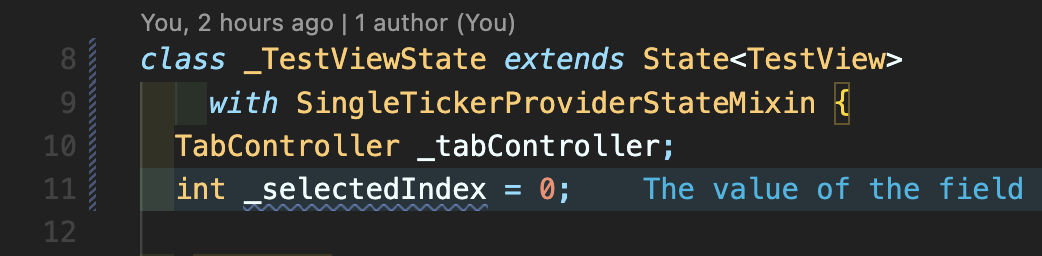 Step1: 9번째 줄에 with SingleTickerProviderStateMixin을 추가하고 10, 11번째 줄에 TabController와 tab을 선택했을 때 선택한 인덱스 값을 담을 수 있는 integer 변수를 하나 선언해줍니다.