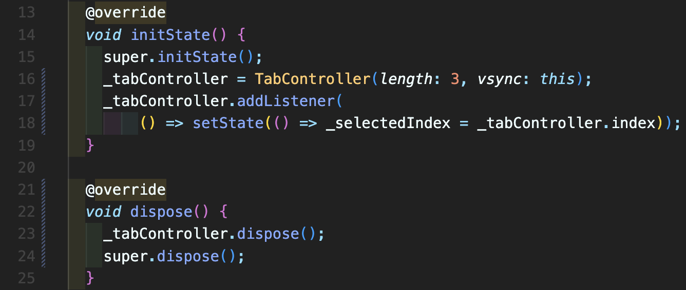 Step2: initState와 dispose 상태에서 tabController에 addListener를 추가해서 tab 메뉴를 선택했을 때 _selectedIndex 값을 _tabController.index로 assign해줄 수 있도록 해주시고 setState를 통해 상태 업데이트를 해주면 됩니다.