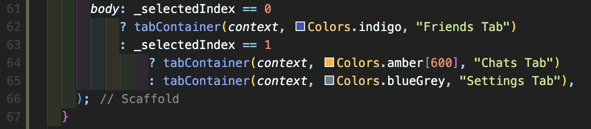 각 메뉴를 클릭했을 때 다른 컨테이너가 나오도록 한 코드는 ? 물음표 기호와 : 콜론을 사용한 Conditional (ternary) operator입니다. if else 대신 이것을 사용하여 아래처럼 나타낼 수 있습니다. _selectedIndex == 0 ? [0이면 이것 실행] : [0이 아니면 이것 실행] 이런 방식으로 구현됩니다. 그리고 동일한 구조의 Container 위젯이 3번 사용되기 때문에 별도 컨테이너로 분리했습니다.