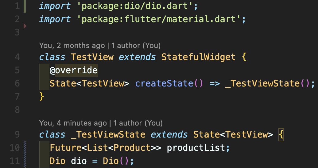 Step 2: dio 임포트 해주고, 11번째 줄처럼 dio 인스턴스를 만들어줍니다. 또한 product를 가져와서 저장할 리스트도 10번째 줄처럼 변수로 선언해줍니다.