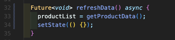 또한 refresh(새로고침)을 위해 refreshData를 다음처럼 적어주시면 되며 setState나 refresh 함수를 사용하시면 되는데 혹시 아래 방법으로 되지 않는 경우에는