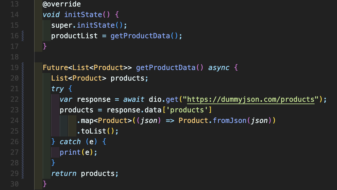 Step 4: FutureBuilder를 사용하기 위해 19번째 줄처럼 Future<List<Product>> 자료형으로 반환하는 함수를 만들어주고 await 키워드를 사용해서 데이터를 가져오기 때문에 async 키워드도 적어주셔야 합니다. productList가 <List<Product>>이기 때문에 map<Product> 그리고 .toList()로 최종 리스트로 만들어주면 됩니다. 그리고 initState 내에 16번째처럼 productList = getProductData()로 초기 데이터 세팅해주시면 됩니다.